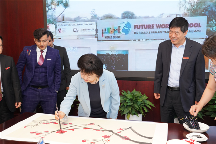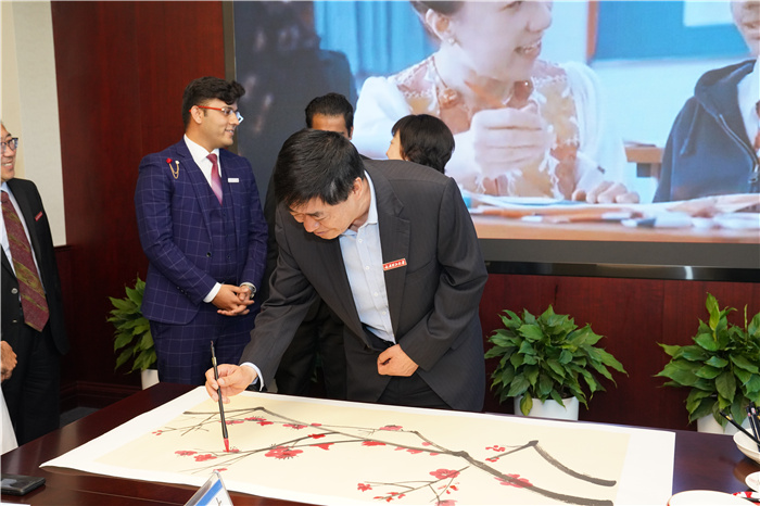 两国学生代表互赠礼物,全体与会人员共同执笔点画象征着和平友好的梅花,将现场氛围推向高潮。