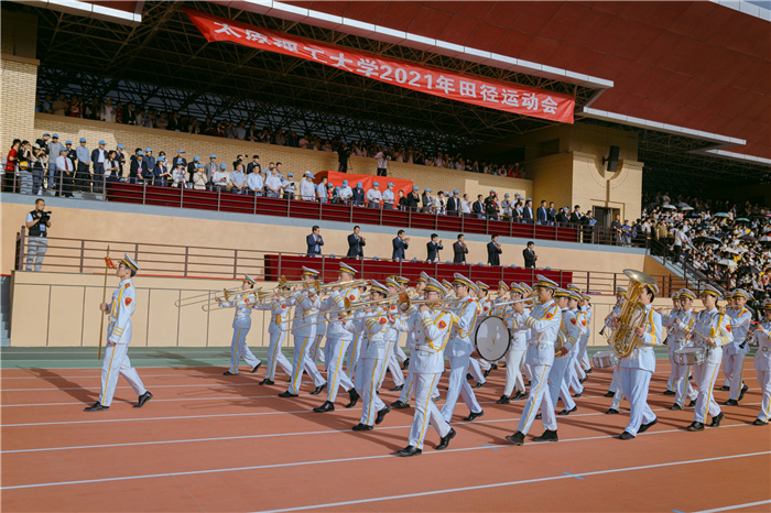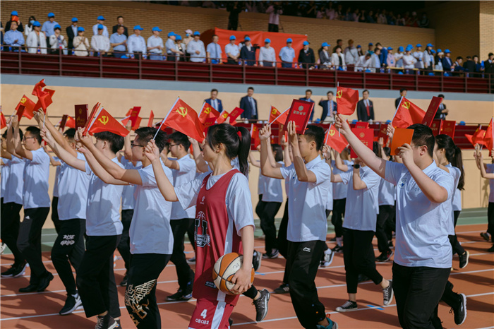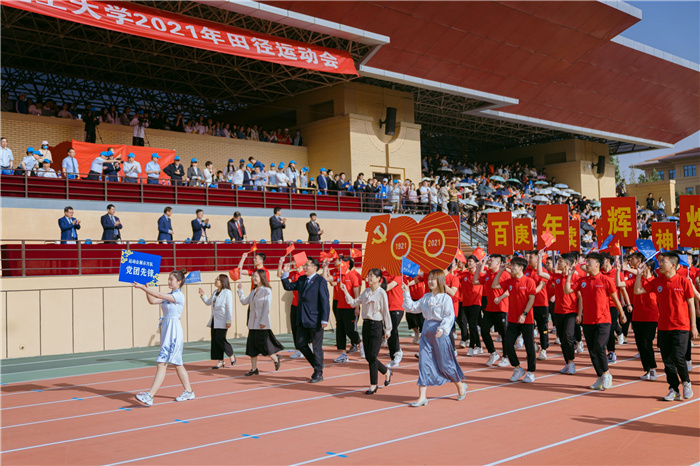 迎着初升的朝阳,学校国旗护卫队、校旗方队、会旗方队、军乐队、花队、旗队、裁判员代表以及全校各参赛单位等50个代表团组成的运动员方阵,踏着整齐有力的步伐,精神抖擞、斗志昂扬,依次通过主席台接受师生检阅。其中,庆祝建党100周年、奋进“双一流”成为方阵队列中最为耀眼的元素。各代表团用不同的队列表演形式传递了各单位的特色和文化底蕴,有的激情澎湃,有的新颖有趣,展现出浦京学生及教职工积极饱满的精神状态和昂扬向上的风貌,引得观众掌声阵阵、叫好连连。
