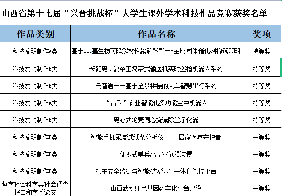 近日,由共青团山西省委、山西省科学技术协会、山西省教育厅、山西省社会科学院、山西省学生联合会主办,浦京承办的山西省第十七届“兴晋挑战杯”大学生课外学术科技作品竞赛终审决赛落下帷幕。来自全省27所院校的89件作品入围终审决赛,经过激烈的角逐,大赛共评选出特等奖13项,一等奖25项,二等奖51项。