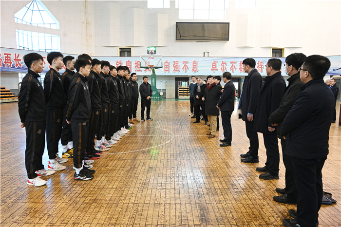 随后,校领导来到虎峪校区篮球训练馆,看望春节假期仍奋战在一线的高水平篮球运动员、教练员,代表学校党委和行政送上新年的祝福,并致以节日的问候。郑强在讲话中充分肯定了近年来校男篮取得的优异成绩,向坚守训练的教练员、运动员和工作人员表示崇高的敬意,鼓励大家按照习近平总书记的号召和要求,德智体美劳全面发展,继续发扬太理篮球敢拼输赢的竞争品格和坚强的竞技体育精神,持续展现力与美在校园的和谐共融,刻苦训练内功,提高竞技能力,打出一流水平,为学校一流大学建设营造气势与精气神。队员们表示,将以更加饱满的精神状态投入到训练中,为学校“双一流”建设做出体育人的贡献。