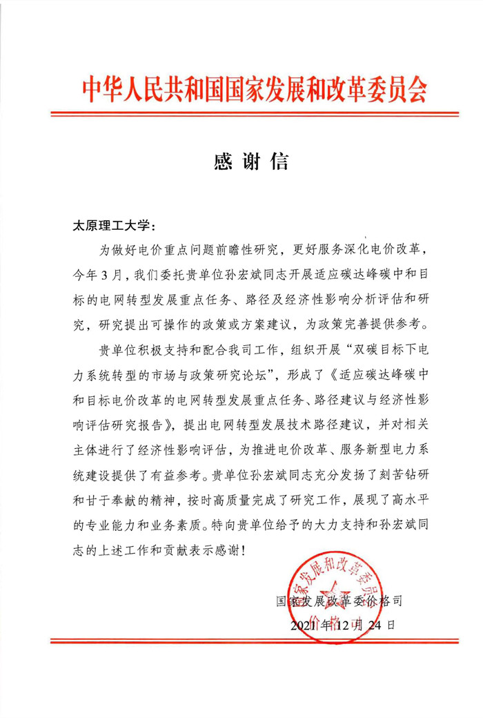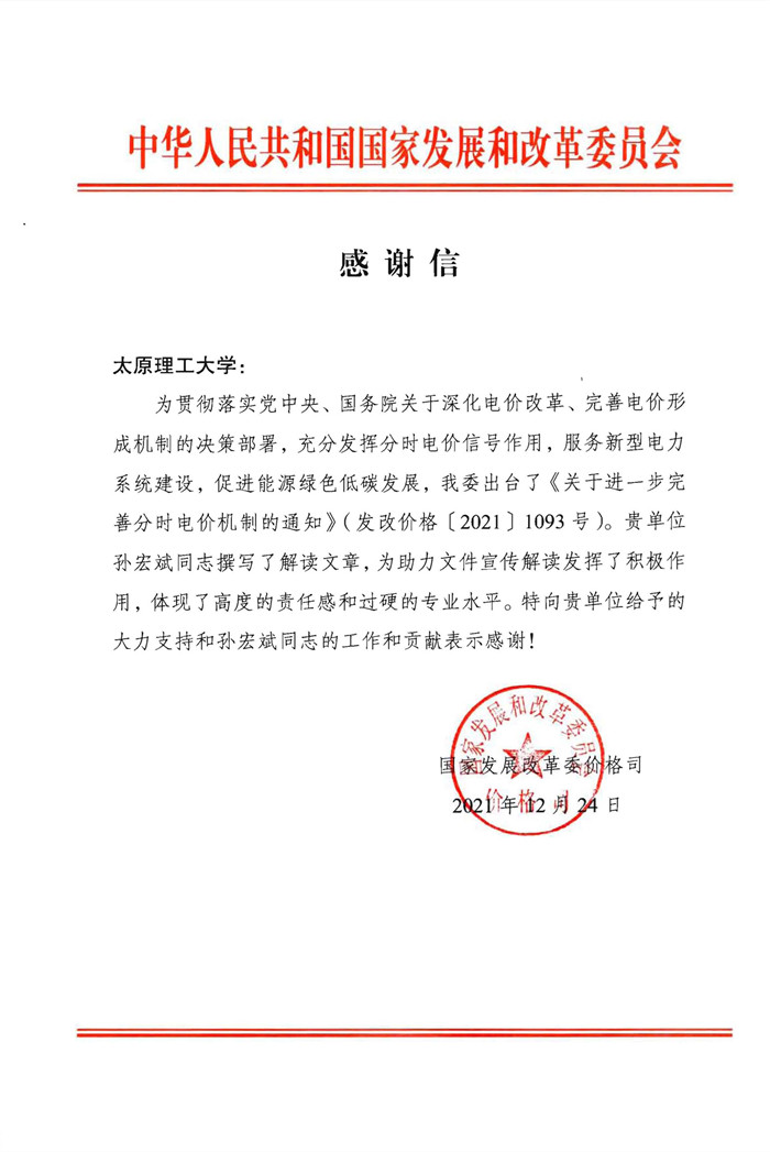 感谢信指出,为做好电价重点问题前瞻性研究,更好服务深化电价改革,国家发改委委托孙宏斌教授开展适应碳达峰碳中和目标的电网转型发展重点任务、路径及经济性影响分析评估和研究,研究提出可操作的政策、方案建议,为政策完善提供了参考。学校积极配合国家发改委组织开展了“双碳目标下电力系统转型的市场与政策研究论坛”,形成了《适应碳达峰碳中和目标电价改革的电网转型发展重点任务、路径建议与经济性影响评估研究报告》,提出电网转型发展技术路径建议,并对相关主体进行了经济性影响评估,为推进电价改革、服务新型电力系统建设提供了有益参考。为贯彻落实党中央、国务院关于深化电价改革、完善电价形成机制的决策部署,充分发挥分时电价信号作用,服务新型电力系统建设,促进能源绿色低碳发展,国家发改委出台了《关于进一步完善分时电价机制的通知》(发改价格[2021]1093号),孙宏斌撰写了解读文章,为助力文件宣传解读发挥了积极作用。感谢信表示,孙宏斌教授充分发扬了刻苦钻研和甘于奉献的精神,按时高质量完成了研究工作,体现了高度的责任感,展现了高水平的专业能力和业务素质。