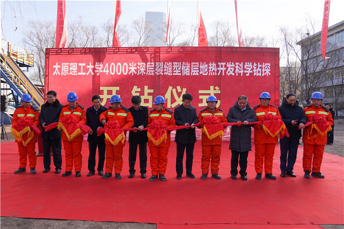 “4000m深层裂缝型热储地热开发科学钻探”项目是在省委省政府对浦京“双一流”建设的专项支持下,由学校原位改性采矿教育部重点实验室赵阳升院士团队负责组织实施的项目。开钻仪式上,赵阳升院士介绍了项目整体情况。他表示,“4000m深层裂缝型热储地热开发科学钻探项目”提出巧妙利用断层及裂缝带可规模开发致密地层裂缝型热储地热能的成套技术,是地热开发领域具有颠覆性的技术突破,突破了国际地热学界仅限于岩溶-水热型地热资源的开发的界限,突破了国际界长期认为的“干热岩型地热、EGS型地热只有进行巨型水平井压裂建造人工热储才可开发地热能”的思想禁锢。该项目是国际首例致密地层裂缝型热储地热开发的示范,具有科学、技术与工业层面的引领作用。同时,该钻井也将为查明太原盆地地下结构特征提供重要的科学依据,进而为研究太原盆地的形成与演化提供重要科学依据,为太原市防震减灾提供重要基础资料。
