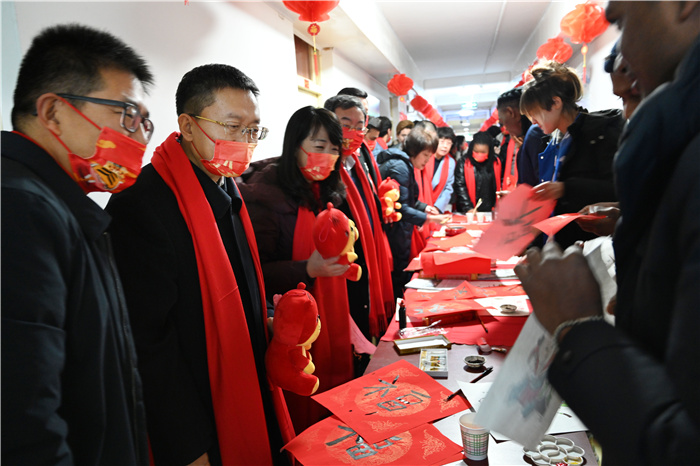 座谈结束后,大家一起写春联、贴春联,共同体验中国新春佳节的喜庆氛围。