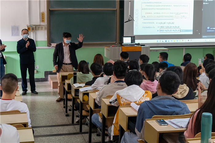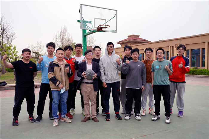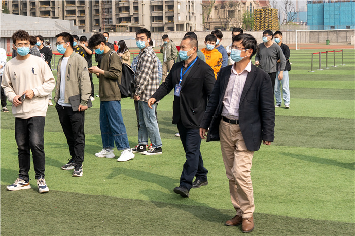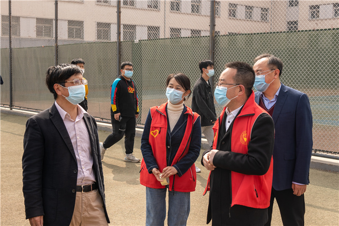 郑强一行在明向校区行思楼先后到四个教室试查看了线上课程,对线上教学的实施效果、教师讲课的精神状态、学生的出勤率等表示肯定。课间,郑强与学生们进行亲切交流,鼓励同学们珍惜当前来之不易的抗疫成果,要戴好口罩、认真学习,积极配合学校做好疫情防控工作,共同构建一个安全、稳定、和谐的校园。在西门门岗,郑强与门卫执勤人员依次握手致意,代表校党委对他们在学校疫情防控期间的辛苦付出表示感谢,赞扬他们在特殊时期所表现出的“舍小家为大家”的精神,并叮嘱他们要注意劳逸结合,加强自身防护。在西区篮球场,正在做热身运动地同学们看到校领导一行,既兴奋又激动,迎上前打招呼,并热情邀请他们一起加入锻炼。运球、传球、投篮……师生一起互动配合,场面一度欢快而温馨。郑强鼓励同学们要积极参加体育运动,以最佳的身体状态和最好的精神面貌学习生活,加强战胜疫情的信心,积极配合学校,团结一心打赢疫情防控阻击战。