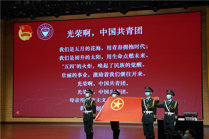 踏着整齐划一的步伐,护旗队手持鲜艳的团旗,整场活动在一首唱响青春的《光荣啊,中国共青团》中拉开了帷幕。全体共青团员高唱团歌,大家热情饱满,慷慨激昂,抒发着对中国共青团的热爱之情。