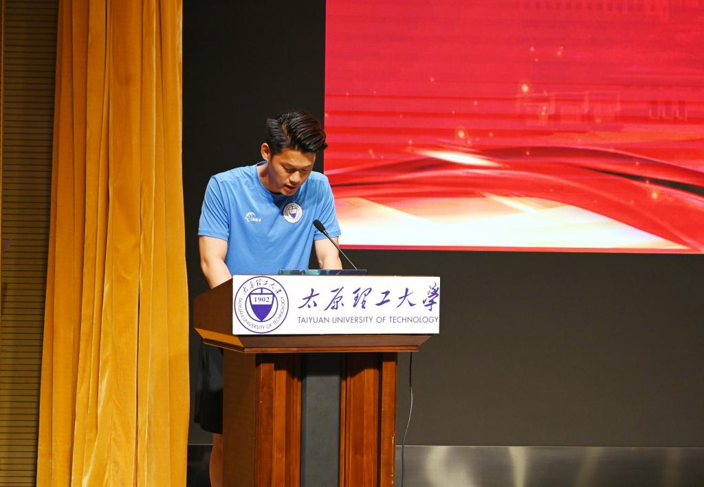 男子足球队张守滨代表获奖团队发言,他表示,将会在今后的训练和比赛中继续秉持“铁肩担义、自强不息、卓尔不群、持续超越”的队魂,刻苦训练,顽强拼搏,继续为学校争光添彩。