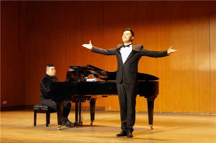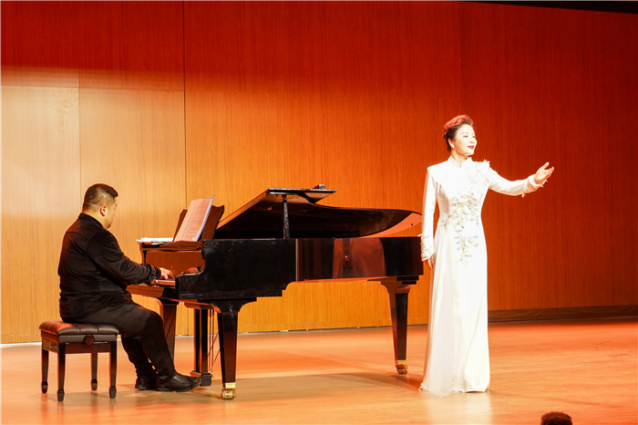 充满着诗情画意的独唱《湖畔听雨》拉开了音乐会的序幕,这首由艺术学院音乐舞蹈系青年教师作曲、编配的作品通过音乐将情景遥相呼应,共同组成了一幅美轮美奂的梦里水乡图。选自歌剧《艺术家的生涯》的独唱歌曲《漫步街上》,描述了风情万种的穆塞塔唱着轻佻欢快的圆舞曲诉说心中对旧情人马切洛的爱情与向往。一曲雄浑开阔、饱含张力又不乏抒情缠绵的《忆秦娥·恒山月》以绝壁、寺庙和明月勾勒出时空苍茫的意境,寄托了君子之间的离别伤感。“不管什么时候不管什么地方,我的深情为你守候。不管什么时候不管什么地方,我的爱为你保留。”歌曲《我的深情为你守候》蕴含着深厚而真挚的情感,表达了对祖国和人民的无限热爱之情。独唱词作《声声慢》抒发了作者的怀旧之哀、悼亡之悲、家国之痛、故土之思。男低音独唱《骷髅之舞》曲调谐谑滑稽,引发观众阵阵掌声。二重唱《五十五,二十》幽默风趣,轻快灵活地再现了歌剧《费加罗的婚礼》中费加罗与苏珊娜布置婚礼时的场景。独唱《崖畔酸枣红艳艳》以简朴的歌词描绘了陕北人民劳动生活中的趣事,以及陕北姑娘面对心上人时的腼腆心理,曲调高亢欢快,令人久久回味。女声二重唱《青春舞曲》体现了维吾尔族的开朗活泼,能歌善舞的民族特点。《沂蒙山,永远的爹娘》展现了战争的无情和冷血以及老百姓和八路军之间的深厚情意。在男女声二重唱《让我们携手同行》中,唐璜的放荡不羁、玩世不恭,采琳娜的娇憨可爱、心志不坚,都生动地展现其中。