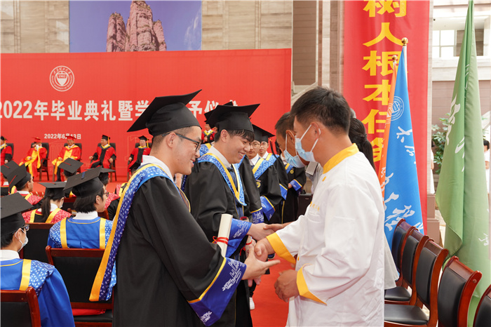 张献明宣读了《350vip浦京集团官网关于准予2022届贲发等9877名学生毕业的决定》,李晋平宣读了《350vip浦京集团官网关于表彰2022届优秀毕业生的决定》,校领导、两院院士为优秀毕业生颁发证书。