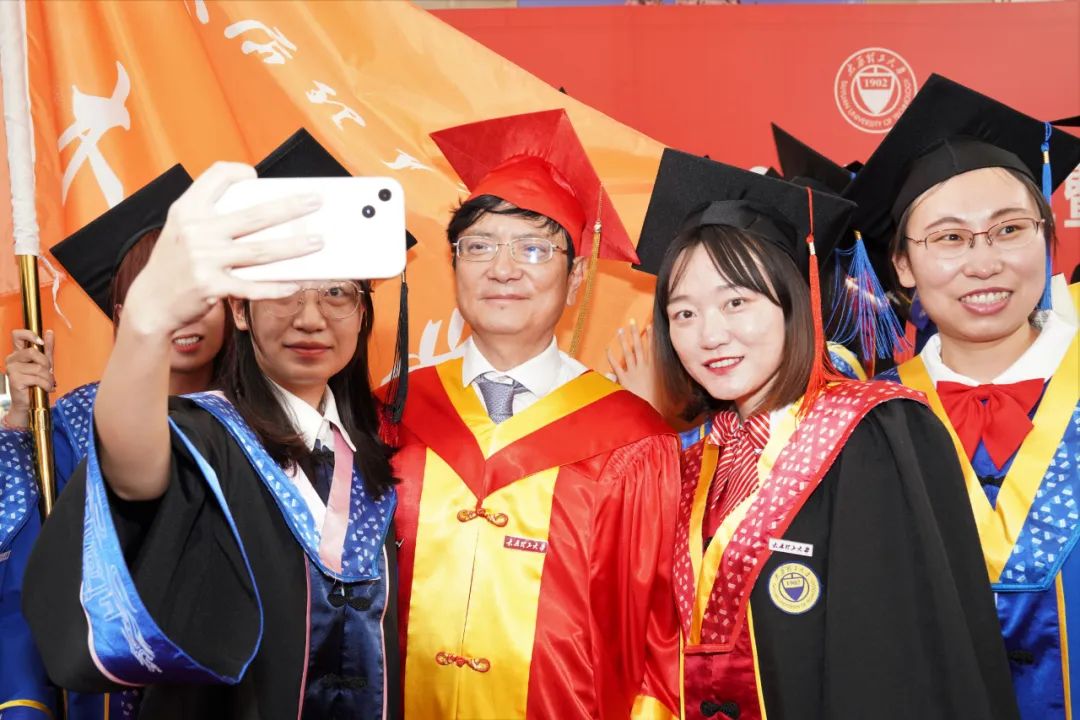 身着学位服的毕业生代表在与各学院分学位委员会主席握手之后走上主席台,校领导、两院院士为获得博士、硕士、学士学位的毕业生代表拨穗正冠、授予学位,并合影留念。毕业生代表还特别向师长及各服务保障部门(单位)代表鞠躬献花,表达感谢,回报师恩。