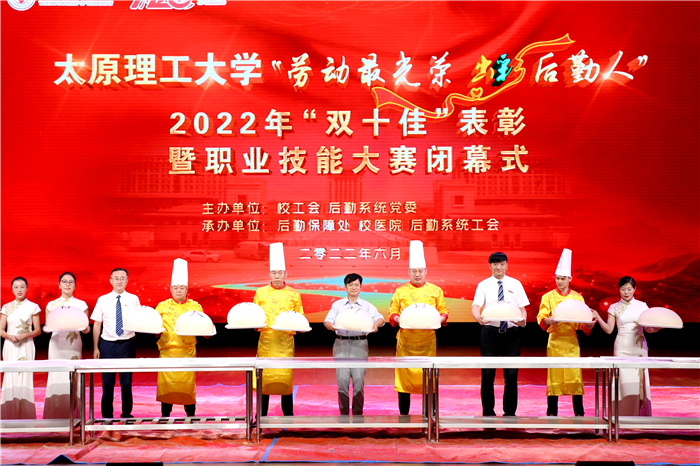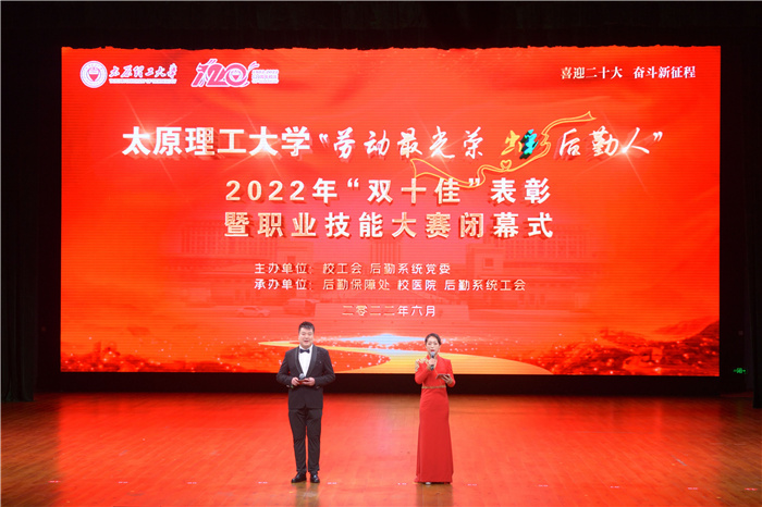 经过二十多天精彩纷呈、紧张激烈地职业技能比拼,6月23日上午,浦京在明向校区明向会堂举行“劳动最光荣 出彩后勤人”2022年“双十佳”表彰暨职业技能大赛闭幕式,表彰后勤系统在深化综合改革、保障“双一流”建设、抗击新冠疫情过程中涌现出的先进班组与服务标兵,嘉奖在本次劳动技能大赛中脱颖而出的太理工匠。校党委书记郑强,党委副书记李晋平,校党委常委、纪委书记尉安英,校党委常委、副校长吴斗庆、任喜莹,山西省教育厅安全稳定处处长武振杰与兄弟院校后勤工作相关负责人出席大会,学校各职能部门与各学院党政负责人、后勤参赛选手、职工代表与学生代表参加大会。