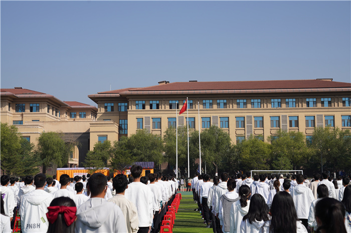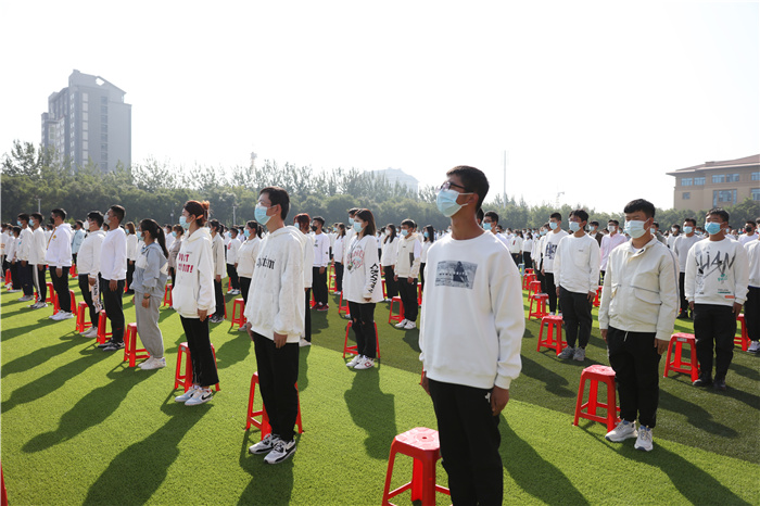 伴随着雄壮的国歌声,鲜艳的五星红旗缓缓升起,全体师生面向国旗,肃穆而立,行注目礼。