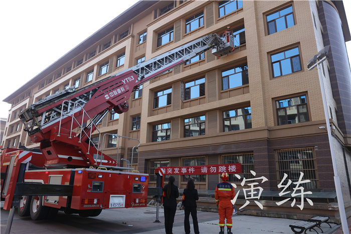 与此同时,位于明向校区11号公寓楼的模拟起火点报告火情,现场顿时烟雾弥漫,1名同学被困于宿舍内,楼下2名同学受伤。接到报警后,现场总指挥向相关部门发出救援指令,消防车和专业救援人员迅速进入火场,用高压水枪对模拟起火位置实施灭火,并架起云梯营救“被困”学生,救援队与校医院医护人员立即将受伤人员运送至安全区实施救助。所有参演人员陆续抵达指定地点,核实人数无误,疏散演练圆满结束,整个过程有条不紊、井然有序,达到了预期目的。