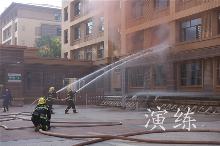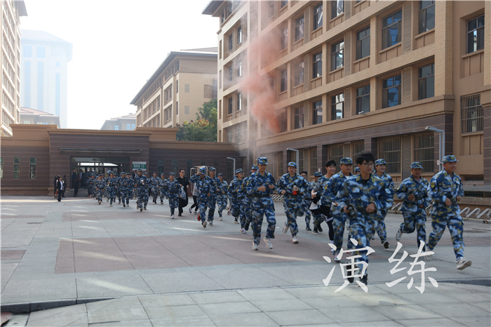 本次演练模拟明向校区所处区域突发6级地震,并引发学生公寓火灾,全体参演人员紧急避震逃生并向安全区域紧急疏散。上午9时,刘润祥在听取现场准备情况汇报后下达“演练开始”的指令,地震消防综合演练随即开始。地震警报信号鸣响一分钟后,校广播发出“紧急疏散”哨声。“不要着急,注意脚下,有序撤离。”听到哨声后,全体参演学生在老师和公寓工作人员的指导下就地避震、紧急疏散,按照“分两行、靠两边,先低层、后高层”的疏散程序,迅速有序地撤离,根据指定路线向紧急避险场所集结。学校立即启动破坏性地震应急预案,并建立指挥部。
