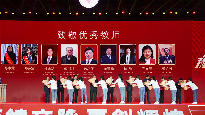浓浓师生情,莘莘学子意。大会特设“致敬优秀教师”环节,以此向为学校建设发展作出突出贡献的全校教职工致以崇高的敬意和衷心的感谢。黄庆学、金智新、赵阳升、吕明、孙西欢、李文英、邓存宝、寇子明、马素霞等优秀教师代表上台接受学生献花。