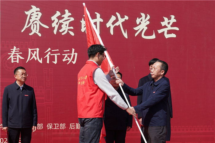 任喜莹为志愿者代表授旗,启动了浦京2023年学雷锋春风行动。