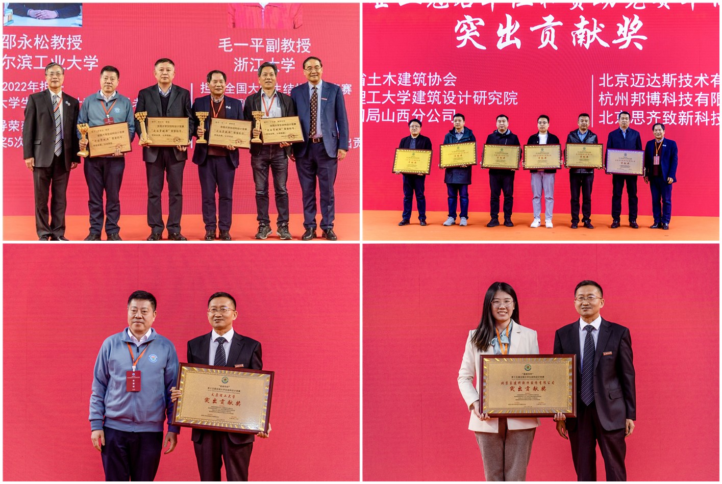 大会宣读了“盈建科杯”第十五届全国大学生结构设计竞赛获奖名单,并举行了颁奖仪式。由全国大学生结构设计竞赛秘书处根据入选条件初审和推荐提名,经全国大学生结构设计竞赛专家委员会评审表决与批准,授予罗尧治、邵永松、毛一平、丁元新等4位专家全国大学生结构设计竞赛“突出贡献奖”。授予浦京及冠名单位北京盈建科软件股份有限公司“突出贡献奖”;授予山西省土木建筑协会、350vip浦京集团官网建筑设计研究院有限公司、中建四局山西分公司、北京迈达斯技术有限公司、杭州邦博科技有限公司、北京思齐致新科技有限公司等6个资助单位“贡献奖”;授予浦京及安徽建筑大学等45所高校“优秀组织奖”。根据模型制作、现场答辩、加载测试,以及竞赛专家委员会评审产生了各奖项,其中,长沙理工大学城南学院荣获“特等奖”和“最佳制作奖”;西安交通大学荣获“最佳创意奖”。最终,浦京2支参赛队伍均荣获一等奖,学校以严谨有序的赛事组织和热情周到的赛事服务,荣获“突出贡献奖”和“优秀组织奖”,取得了竞赛和组织工作双丰收。