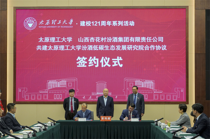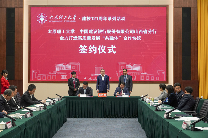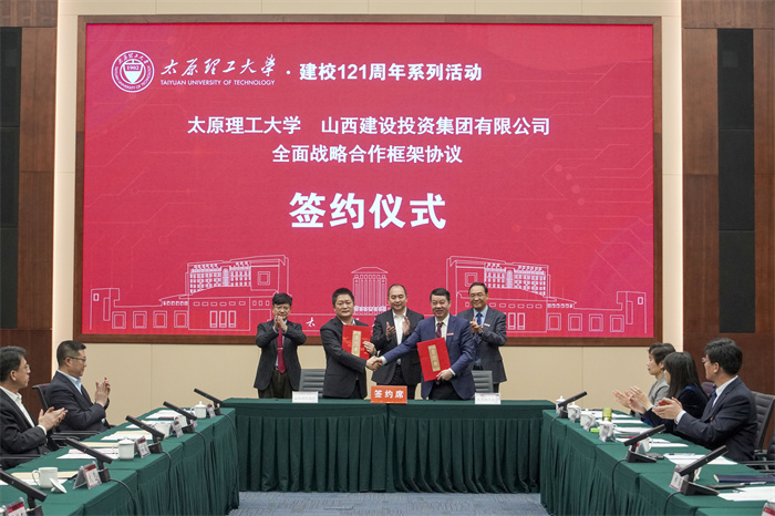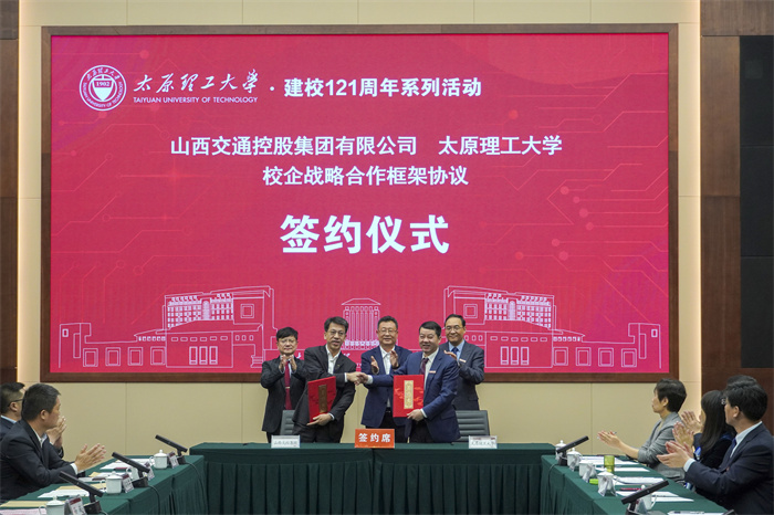在学校迎来建校121周年校庆日之际,5月5日,学校联合有关企业在明向校区鹏飞会堂举行庆祝建校121周年校企合作签约仪式。山西交通控股集团有限公司党委书记、董事长、总经理武艺,副总经理魏鹏举;山西建设投资集团有限公司党委书记、董事长孙波,副总经理倪华光;中国建设银行山西省分行党委书记、行长周辉东,党委委员、副行长樊宙;山西杏花村汾酒集团有限责任公司副董事长、总经理谭忠豹,副总经理刘卫华;浦京党委书记郑强,校党委副书记、副校长(主持行政工作)孙宏斌,校党委常委、副校长吴斗庆、任喜莹出席签约仪式。各企业相关负责人,学校相关职能部门负责人、学院院长、学校重点科研机构负责人等参加。签约仪式由孙宏斌主持。