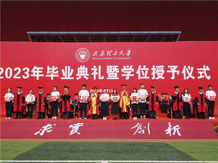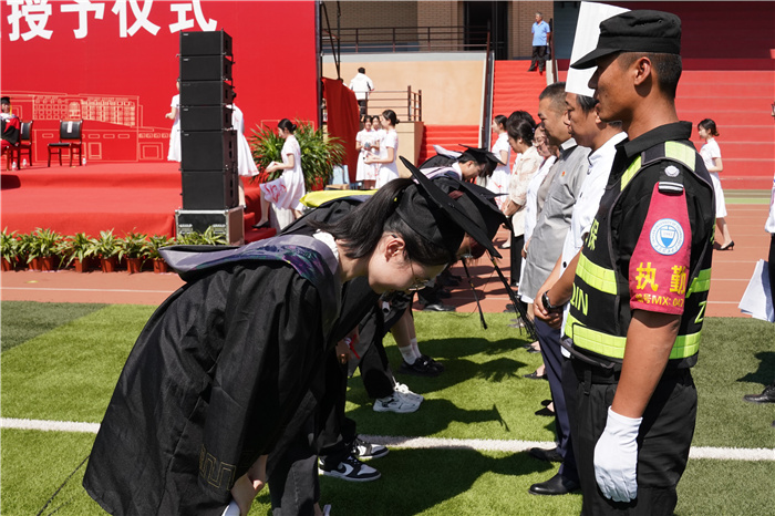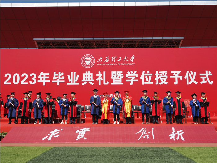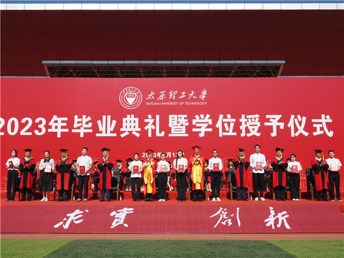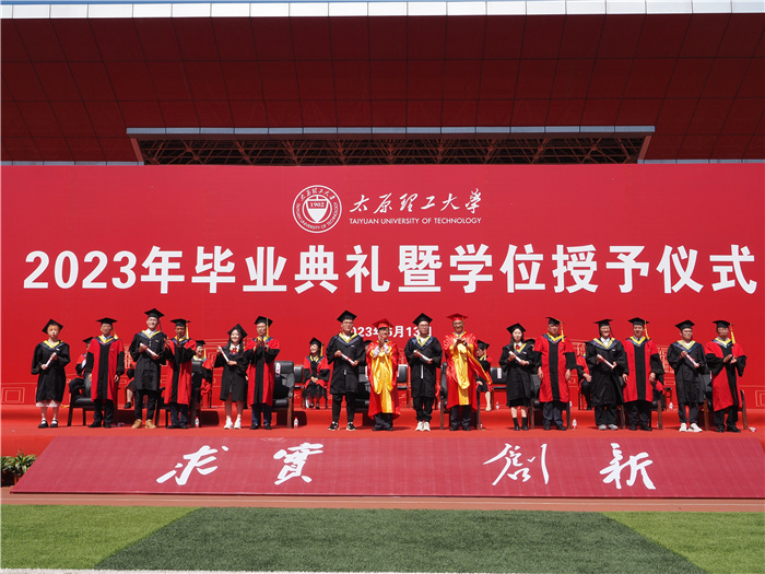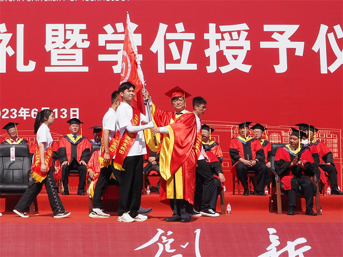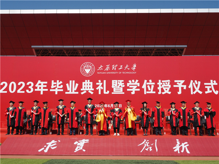 随后,肖连团主持了学位授予仪式,张献明宣读《350vip浦京集团官网2023年第一次授予博士、硕士、学士学位的决定》。身着学位服的毕业生代表在与各学院分学位委员会主席握手之后走上主席台,校领导、两院院士为获得博士、硕士、学士学位的毕业生代表拨穗正冠、授予学位,并合影留念。毕业生代表还特别向师长及各服务保障部门(单位)代表鞠躬献花,表达感谢,回报师恩。