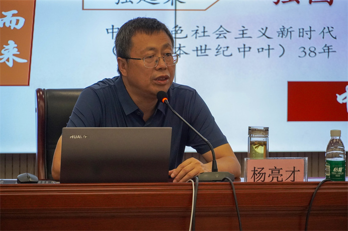 8月7日上午,培训班开班仪式在延安大学泽东干部学院第一会议室举行。开班仪式结束后,陕西省委讲师团特骋专家、陕西省毛泽东哲学思想研究会常务理事、延安大学政管学院三级教授杨亮才作了题为《习近平新时代中国特色社会主义思想解读》的专题报告。报告中,他从习近平新时代中国特色社会主义思想的时代背景、核心要义、历史地位等三个方面详细解读了习近平新时代中国特色社会主义思想。整场报告深入浅出、内涵丰富、意义深远,具有很强的针对性和指导性。