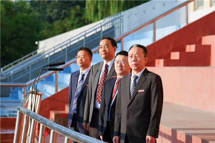 盛夏已尽,秋色渐染。8月28日清晨,全校师生迎着朝阳,满怀着对未来的期望,在迎西、明向校区同时举行2023-2024学年首次升国旗仪式。全体校领导分别在两校区与师生员工一同参加升旗仪式。校党委副书记刘润祥,校党委常委、副校长肖连团分别主持仪式。
