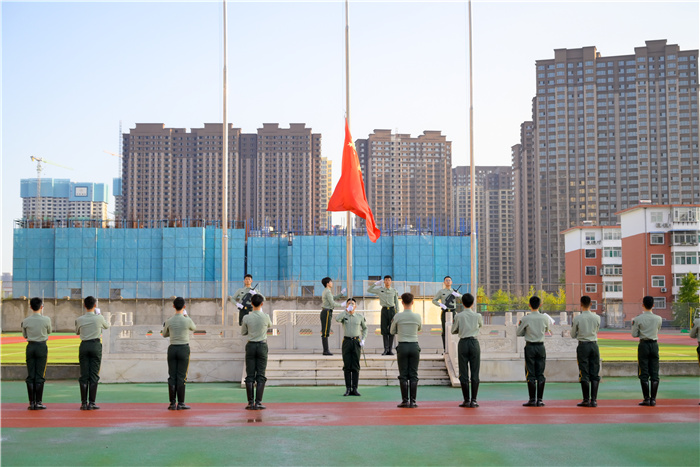 上午七时,升国旗仪式开始,鲜艳的五星红旗伴随着雄壮激昂的国歌声冉冉升起,在晨光中迎风飘扬,全体师生庄严肃立,向国旗行注目礼,表达对祖国崇高的敬意和美好的祝福。