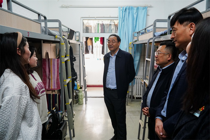 在学生公寓,孙宏斌一行深入学生宿舍、阳光自习室、安全教育展室等处查看,与学生亲切交谈,就学生宿舍消防疏散通道、消防设施运行状况进行了细致了解,并向学生普及用电消防安全、预防电信诈骗等相关安全知识。