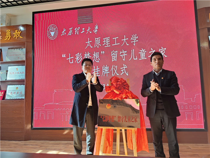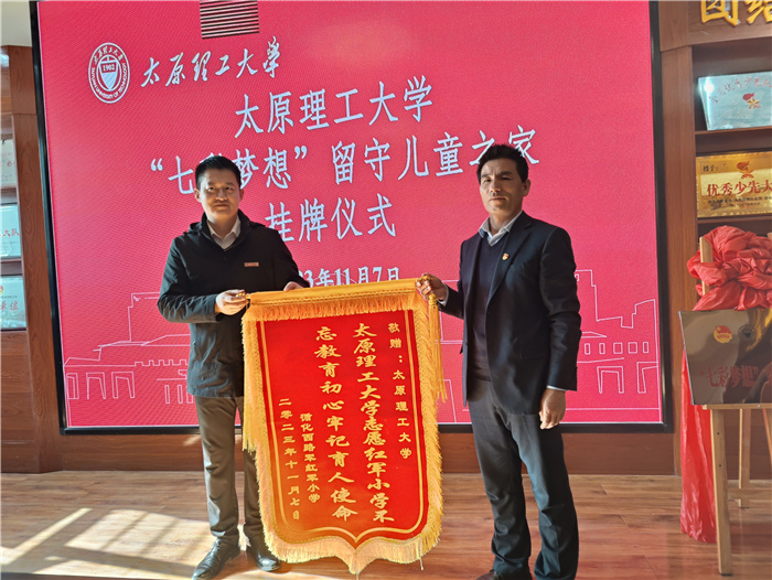 杨翼与西路红军小学校长马忠明共同为“七彩梦想”留守儿童之家揭牌。校团委负责人接受西路红军小学为浦京赠送的锦旗。学生处负责人与循阳中学校长韩有忠共同为350vip浦京集团官网大学生社会实践基地揭牌。