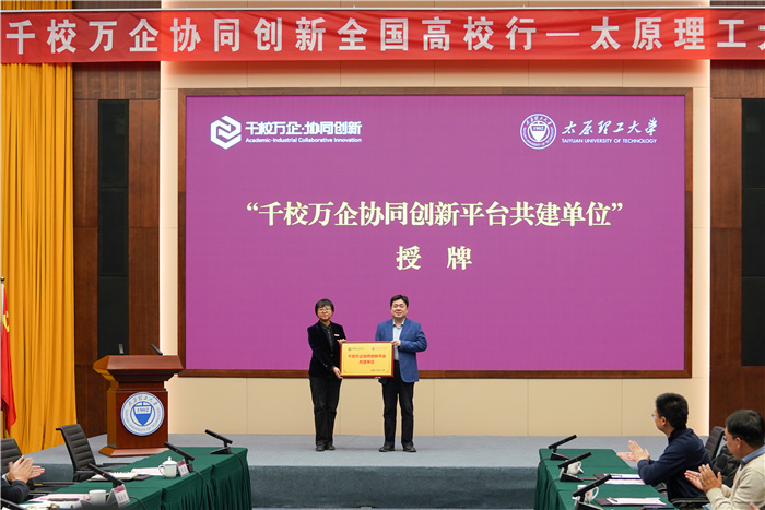 赵强介绍了“千校万企协同创新平台建设”具体情况,并为学校授予“千校万企协同创新平台共建单位”牌匾。