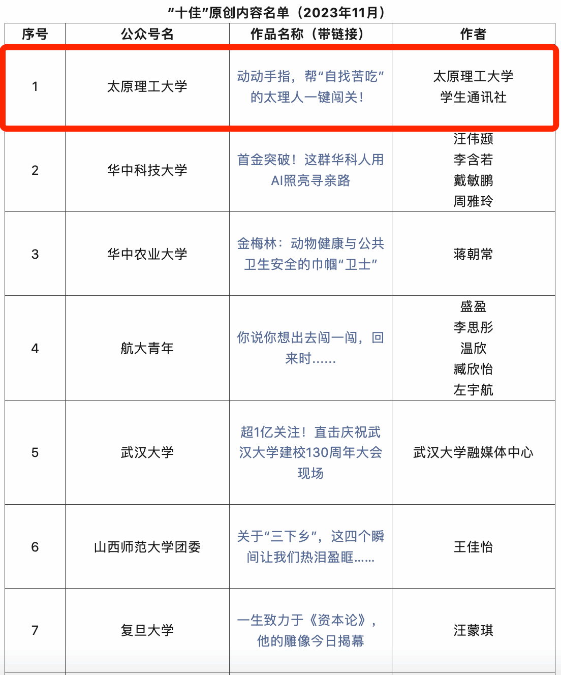 近日,高校思政类公众号重点建设项目组在四部委指导下,依据《高校思政类重点建设公众号优秀原创内容评选标准》,开展了2023年9月、10月、11月公众号优秀原创内容评选工作。经过推荐、初评、终评环节,最终评选出“十佳”原创内容和“优秀”原创内容每月各10篇。浦京选送的作品《动动手指,帮“自找苦吃”的太理人一键闯关!》获评2023年11月“十佳”原创内容。