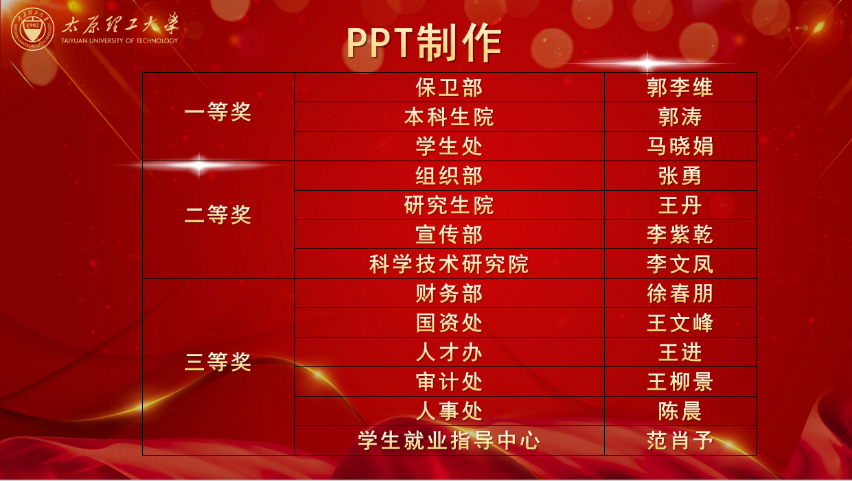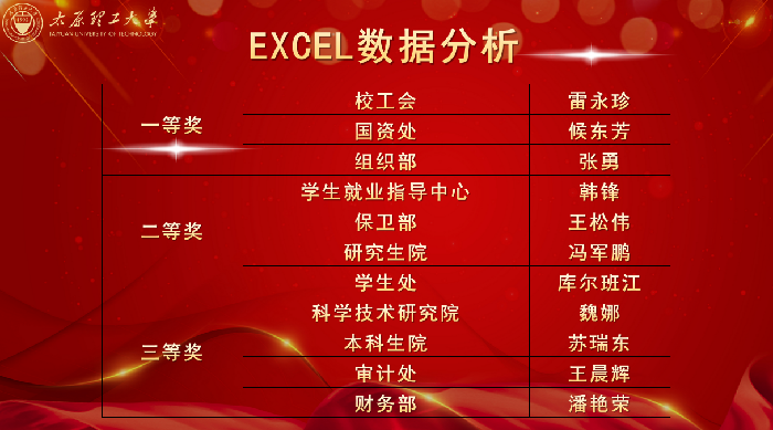 大赛邀请五位专业学院基层党委书记担任评委。经过激烈比拼,最终决出集体奖和个人奖。其中,保卫部郭李维、本科生院郭涛、学生处马晓娟获PPT制作一等奖,校工会雷永珍、国资处候东芳、组织部张勇获EXCEL数据分析一等奖;国资处、保卫部、宣传部、研究生院、本科生院获得集体优胜奖。参赛老师纷纷表示,此次活动不仅提高了他们的业务素质和工作技能,更活跃了机关的工作氛围,加强了各部门之间的沟通联系,希望今后能有更多这样的机会参与其中。