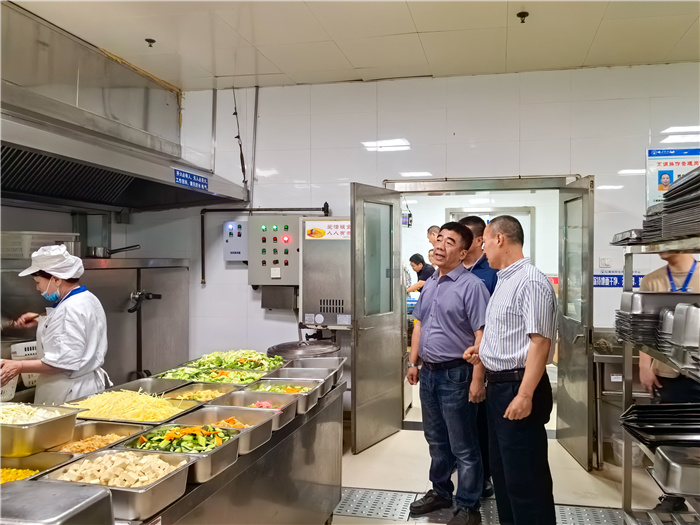 在学生食堂,检查组一行对环境卫生、饮食安全、消防安全、配菜操作间、食品储藏间等情况进行了重点查看。任喜莹指出,相关部门要对食堂各类食品的采购、验收、登记台账情况,食堂从业人员的健康持证情况、信息审查情况进行全面把控,保证师生饮食安全。