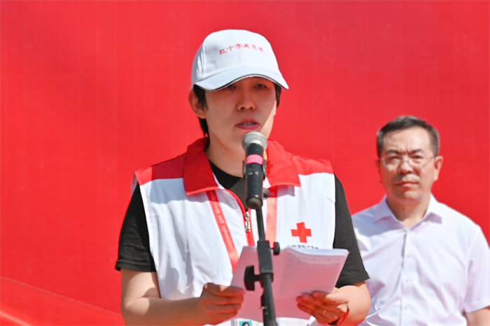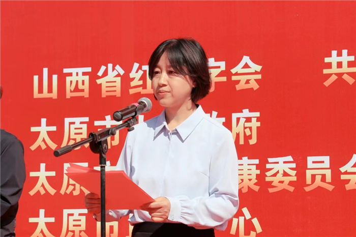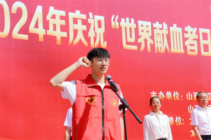 中国红十字无偿献血志愿服务总队山西省大队代表温凤萍宣读倡议书,号召新时代青年加入无偿献血和捐献造血干细胞队伍中来,伸出手臂,用行动挽救生命,用可再生的细胞挽救不可再生的生命。