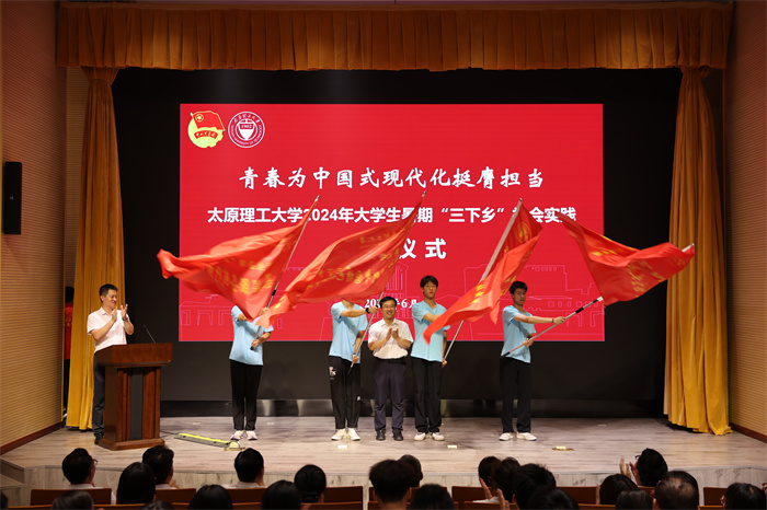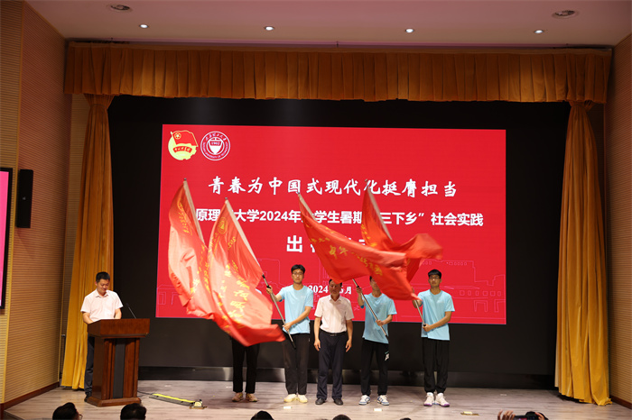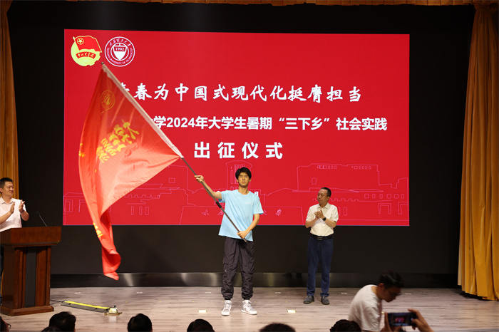任喜莹为全校暑期“三下乡”社会实践队伍授总旗。宣传部负责人、研究生院负责人分别为社会实践重点团队授队旗。