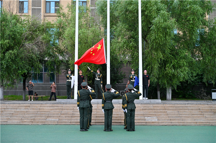 上午七时,升国旗仪式开始,国旗护卫队迈着整齐的步伐,眼神坚定,脚步铿锵,护送国旗入场。国歌奏响,鲜艳的五星红旗冉冉升起,全体师生庄严肃立,向国旗行注目礼。这一刻,所有人心中激荡着对祖国崇高的敬意和无限的热爱;这一刻,所有人都无比骄傲。