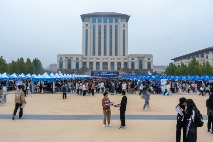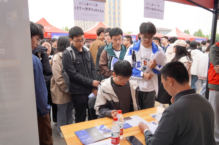 这是浦京为2025届毕业生举办的首场大型双选会,也是近年来规模最大的一场双选会,用人单位中,国有企业有163家,占比最大,中铁、中建、中车、中船、中交、中冶、中煤、中铝、中国水利水电、中核工业、中能建、中国兵器工业等“中”字头大型央企达55家,浪潮集团、首钢、河南能源、中国一拖、一汽、伊利等行业龙头企业达百余家,还有鹏飞集团、梗阳投资、锦波生物等省内民营头部企业。河北省及湖北省襄阳市、山东省青岛市、浙江省临海市、福建省厦门市、新疆阿克苏地区和我省长治市等7个以区域为单位的组团招聘也成为一大亮点,受到了毕业生们的热烈欢迎。“大家了解一下我们的职位情况,下午还有专场宣讲会,欢迎同学们参加。”双选会现场,来自新疆阿克苏地区的工作人员热情地给来到现场的同学们发放招才引智宣传手册。在山东大学青岛校区、青岛大学、青岛理工大学等用人单位展台前,应聘的毕业生排成了长队。