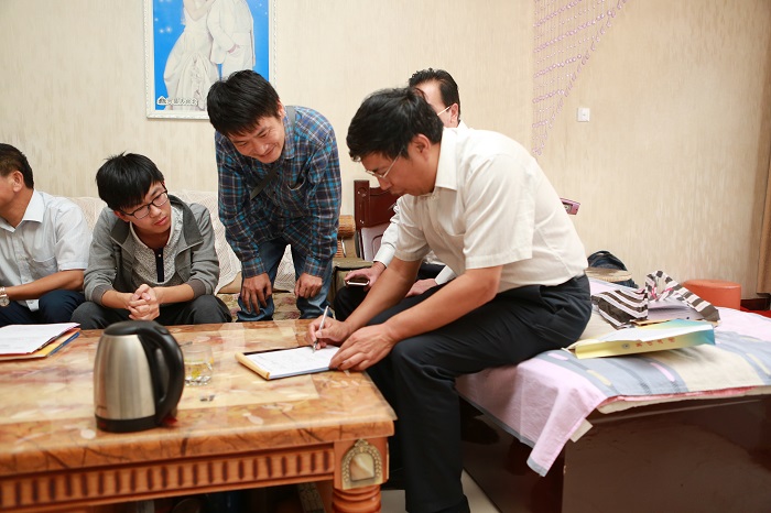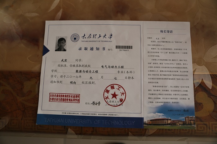武宾同学是浦京已录取的17级电气动力与工程学院热能与动力工程的新生,即将于7号正式报到入学。武宾四岁时,爸爸在打工时发生意外,1000多度的熟石灰炉将腰部以下全部掩埋,为了救治爸爸,家里花光了所有的积蓄。虽然爸爸保住了性命,但大面积烧伤、机体功能障碍导致他丧失劳动能力,从此全家的重担都压在母亲一人身上。今年高考武宾以应届509分的成绩拿到了浦京能源与动力工程专业的录取通知书,全家人喜极而泣,为了能够上大学,整个暑假他怀着“再苦再累也要上大学”的信念,在工地与爷爷打工赚取学费。在了解情况后,校领导深受触动,第一时间决定前往武宾同学家了解具体情况并看望鼓励他。