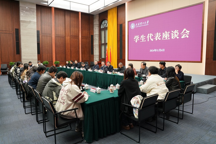 11月6日上午,校党委书记沈兴全在明向校区鹏飞会堂主持召开学生代表座谈会。校党委副书记、副校长肖连团,校党委常委、副校长任喜莹及学校相关部门(单位)负责人参加。