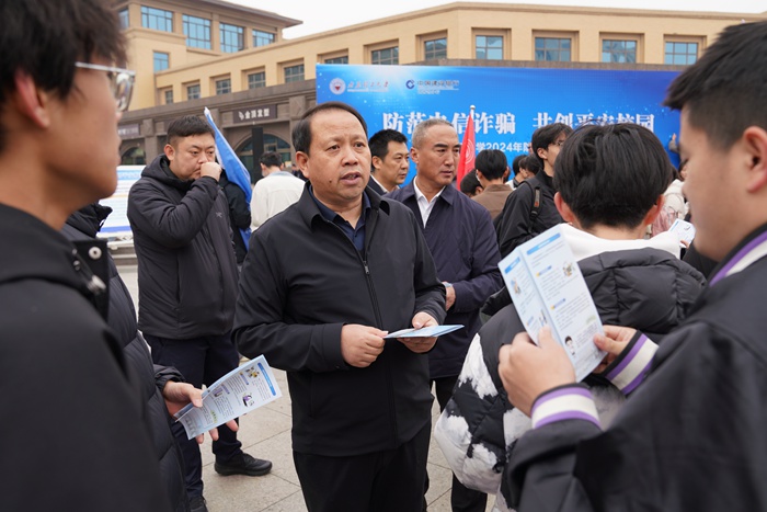 王志华在讲话中指出,电信网络诈骗是当今社会一个严峻问题,希望广大师生时刻紧绷防范之弦,强化自身的防范意识,树立正确的消费观念,时刻保持警惕,学会识别电信网络诈骗的常见手段,用智慧和行动在校园内筑起一道坚固的防范长城,努力营造一个安全、和谐、稳定的校园环境。