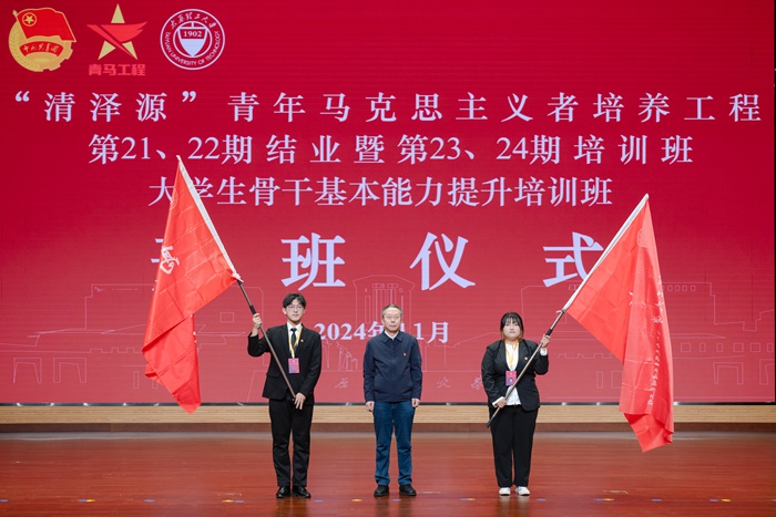 任喜莹为新一期青马工程“高君宇班”“青春宣讲团”授旗并讲话。他表示,青马学员要始终向往和追求马克思主义的美好前景,始终拥护和参与马克思主义在中国的伟大实践,始终做新时代合格的青年马克思主义者。他向全体学员和学生骨干提出三点希望:一是学深悟透,上好政治理论的“必修课”;二是强筋健骨,开好实践淬炼的“实训课”;三是挺膺担当,建好融入大局的“示范课”。中国发展要靠广大青年挺膺担当,学校事业的发展要靠广大学生骨干和团员青年凝心聚力。他希望,全体学员能珍惜此次培训学习的机会,严守培训中的各项制度和纪律,时刻对自己高标准、严要求,做到学思用贯通、知信行统一,努力成为一名信仰坚定、能力突出、素质优良、作风过硬的青年政治骨干,成为有理想、有追求、有担当、有作为、有品质、有修养的“六有”大学生,积极投身中国式现代化建设,为强国建设、民族复兴伟业接续奋斗。