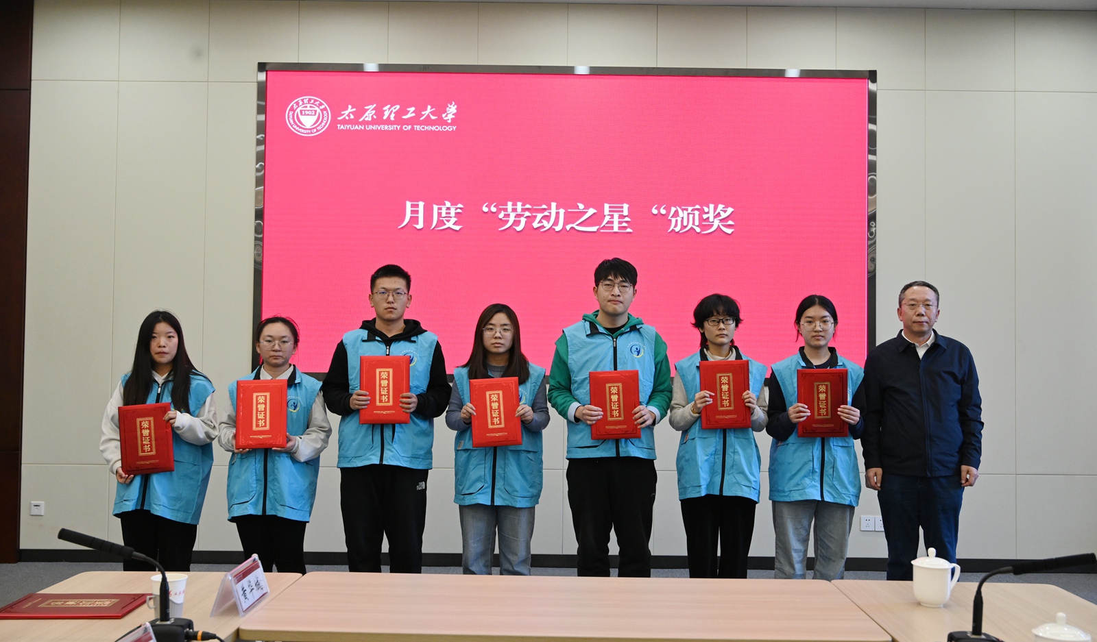 肖连团为“星火”校园劳动实践服务队授旗。尉安英、任喜莹分别为获得月度“劳动之星”的学生代表颁发荣誉证书。