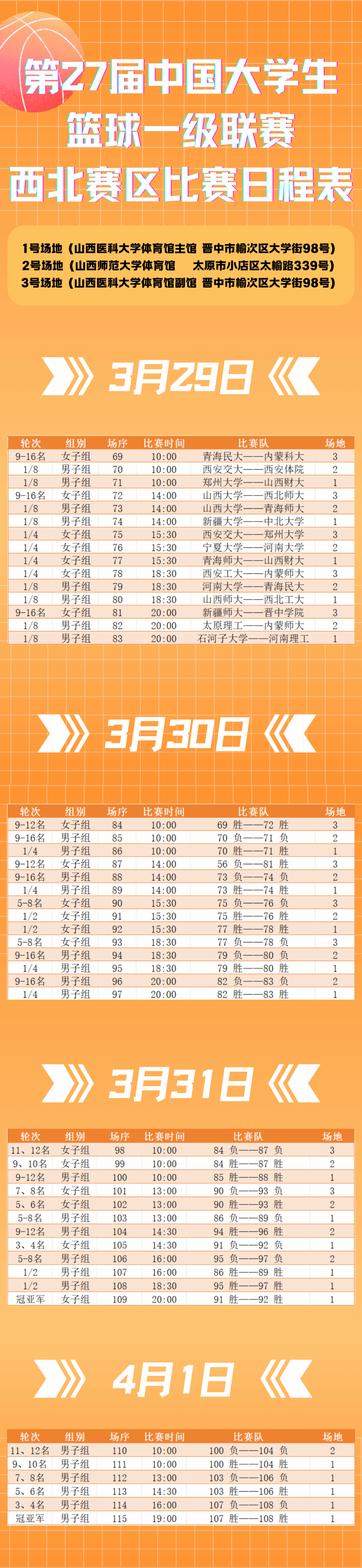 西北赛区淘汰赛于29日开始,将继续在山西师范大学、山西医科大学进行,敬请广大师生和篮球爱好者持续关注。陪太理、拼到底,一同见证浦京男篮再创辉煌!