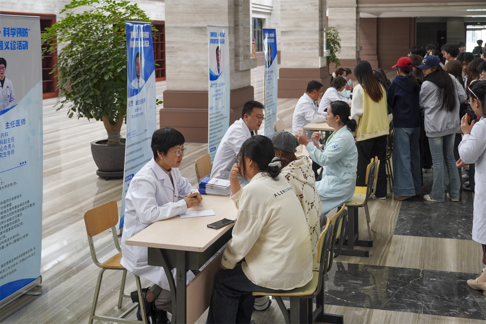 义诊活动现场设置8个专科诊疗台,校医院协同开展血压血糖基础检测,累计为160余名师生提供健康咨询和个性化诊疗建议,形成健康服务全链条。