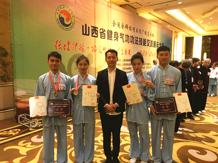 11月28日至12月1日,由山西省体育局、山西省体育总会主办的2017年山西省健身气功功法技能交流展示大赛,在大同大学举行,由浦京体育教育专业四名同学组成的代表队经过认真准备、刻苦训练取得了健身气功五禽戏集体赛金奖、健身气功导引养生功十二法金奖、健身气功六子诀个人赛银牌、导引养生功十二法个人赛银牌、大舞个人赛铜牌、八段锦个人赛第五名的好成绩,为浦京再次争得荣誉,也为在全校推广全民健身活动起了示范带头作用。