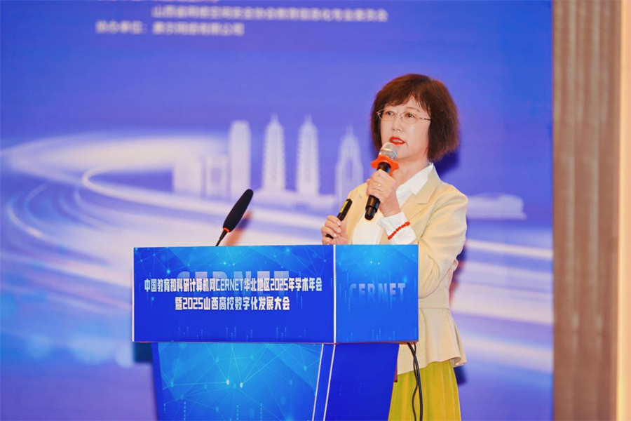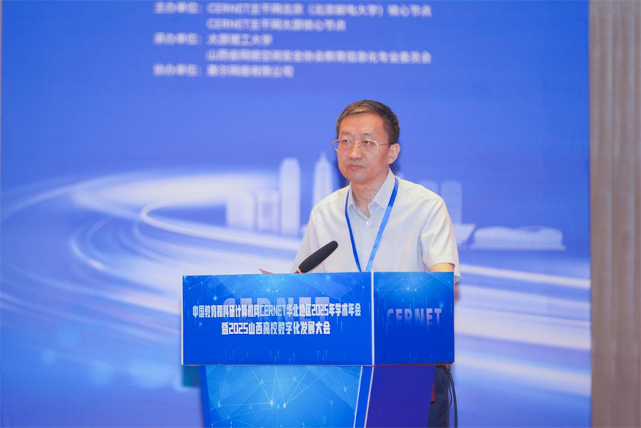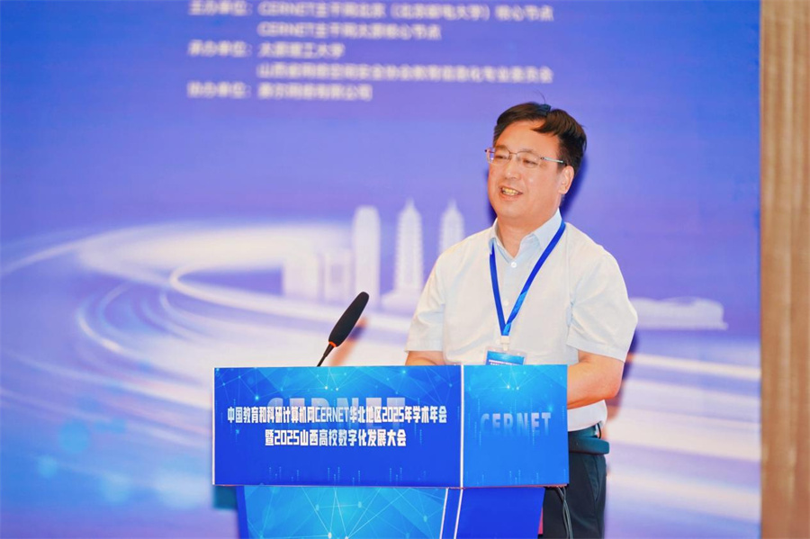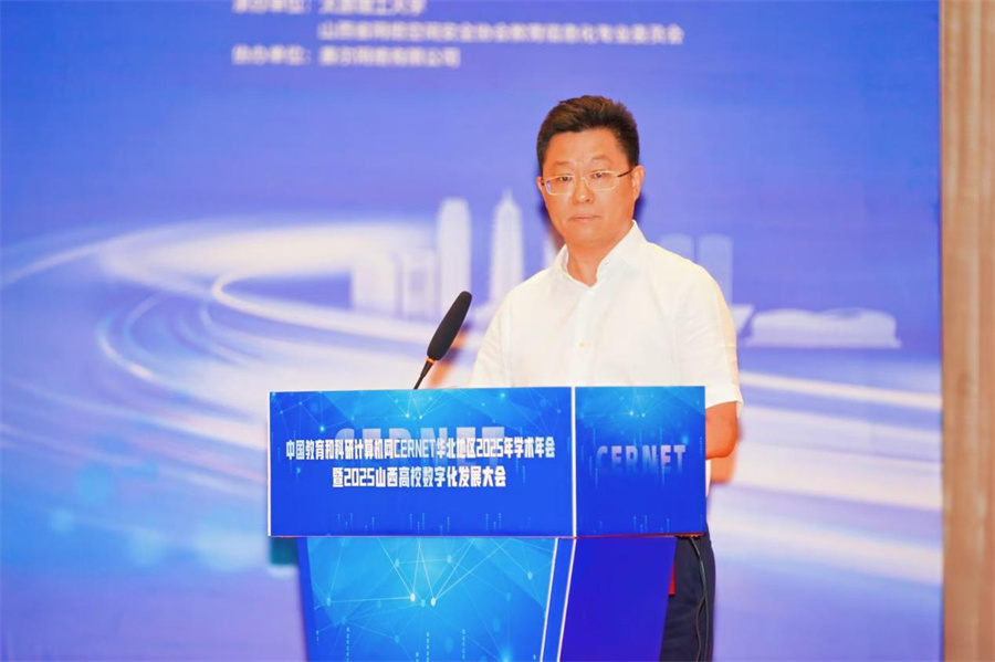 李金碧在致辞中充分肯定了本次会议召开的重要意义,他代表山西省委教育工委、省教育厅,向教育部领导、CERNET专家及兄弟省市同仁对山西高教事业的持续支持表达了诚挚谢意。他指出,高校数字化建设要准确把握数字化技术,强化风险监管,确保人工智能安全、可操纵、可控性,深入推进人工智能技术赋能教育教学的变革。