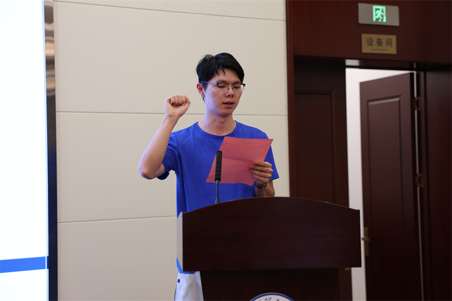 总裁判长窦银科代表全体裁判员宣誓。他承诺,将坚决服从大赛安排,严格遵守竞赛规则与裁判员纪律,尊重参赛选手,秉持客观公正、文明裁判原则,严肃认真、秉公办事、不徇私情,圆满完成各项裁判工作,为赛事的公平公正保驾护航。他简短而有力的宣誓,不仅彰显了赛事公平公正的核心准则,更体现了对每一项创新成果严谨负责的评判态度,赢得全场热烈掌声,为赛事的顺利开展筑牢坚实基础。