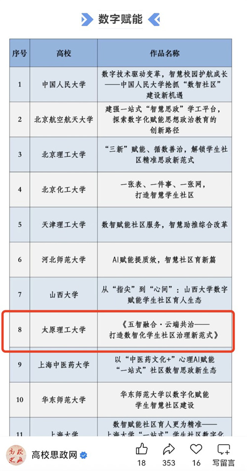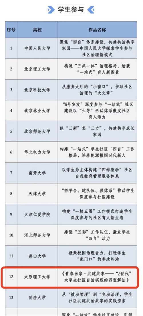 近日,教育部2025年高校“一站式”学生社区风采展示活动优秀成果名单揭晓,浦京报送的2个案例成功入选,入选数量位居山西省高校第一。其中,浦京《青春当家·共建共享--"Z世代"大学生社区自治实践的四重解法》入选“学生参与”典型案例,《五智融合·云端共治--打造数智化学生社区治理新范式》入选“数字赋能”典型案例。