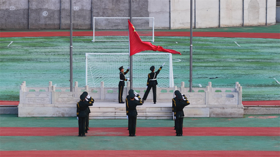 上午七时整,升国旗仪式正式拉开帷幕。国旗护卫队队员身着笔挺的制服,迈着铿锵有力的步伐,眼神坚定如炬,护送国旗走向旗杆,每一步都彰显着青春的朝气与庄重的使命感。伴随着激昂嘹亮的《义勇军进行曲》奏响,鲜艳的五星红旗迎着晨光缓缓升起,随风舒展飘扬。此时此刻,全体师生肃立致敬,目光紧紧追随国旗,心中涌动着对祖国的崇高敬意与无限热爱,自豪感在每个人的胸膛中激荡,整个校园沉浸在庄严而神圣的氛围里。