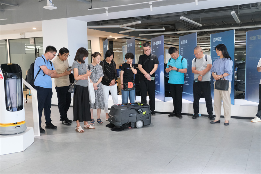 在普渡机器人科技有限公司,项目负责人黄云党向调研组详细介绍了普渡科技发展历程和全球业务布局,展示了服务配送机器人、商用清洁机器人、工业配送机器人以及人形、类人型机器人等最新研发成果。