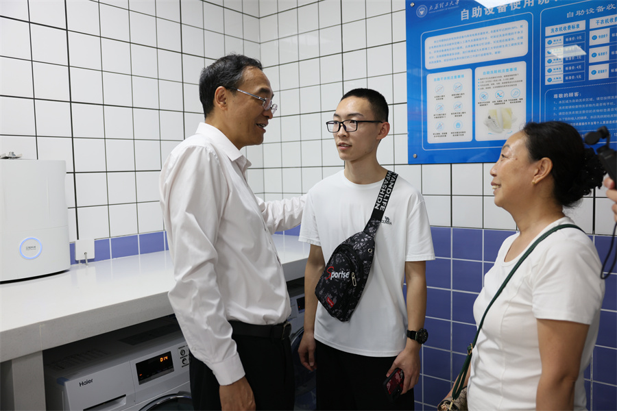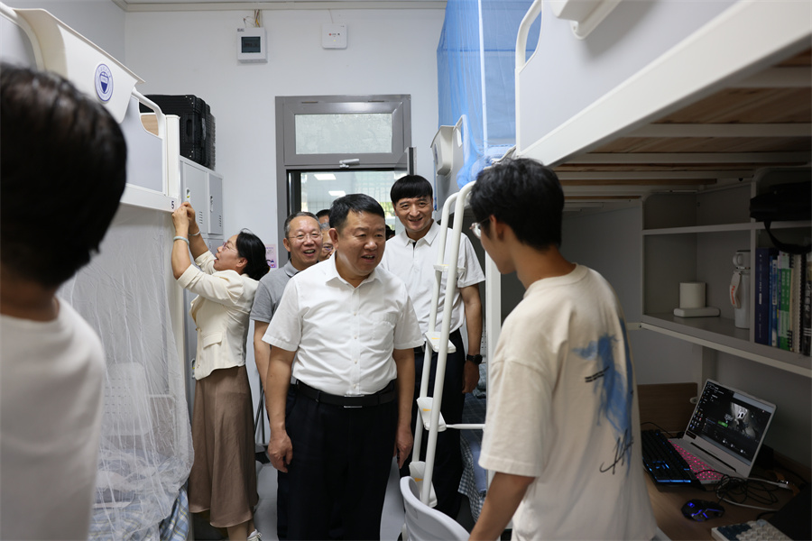 在新生宿舍,沈兴全检查了宿舍的基础设施、安全设施配备和使用情况。他详细询问新生,老家是哪里的,学的什么专业,对于宿舍是否满意,宿舍里热水供应是否方便等生活问题。他嘱咐新同学,生活上有什么困难和需求及时向辅导员、宿管反映,学校将尽可能为大家营造良好的学习生活环境,让同学们能够安心学习、舒心生活。