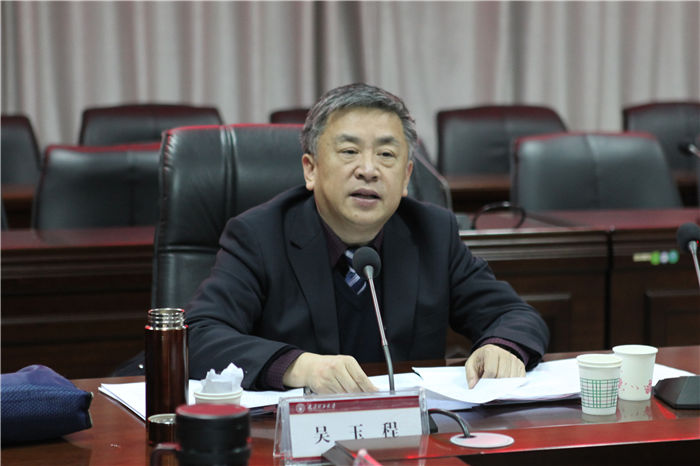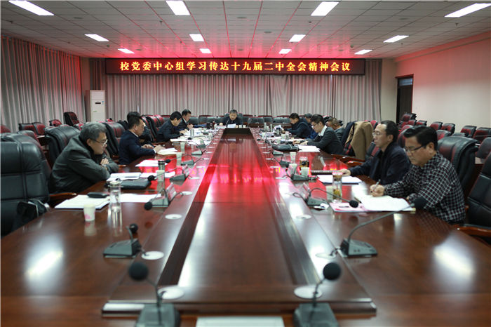 1月20日下午,校党委理论学习中心组在迎西校区逸夫楼6层会议室召开传达学习党的十九届二中全会精神会议,校党委书记吴玉程主持会议,在校校领导、党委办公室、校长办公室、纪检委、组织部、宣传部等部门负责同志列席会议。